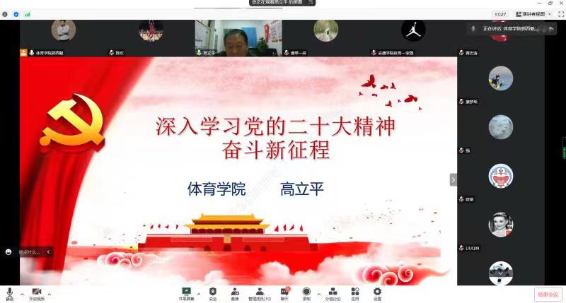 本次工会活动运用“腾讯会议”软件以线上形式开展,邀请beat365官方网站党总支书记高立平同志为beat365官方网站全体教师作了题为《深入学习党的二十大精神—奋斗新征程》的主题报告,从党的二十大召开概况;党的二十大的主要精神和如何贯彻党的二十大精神等三个方面进行了宣讲。