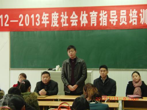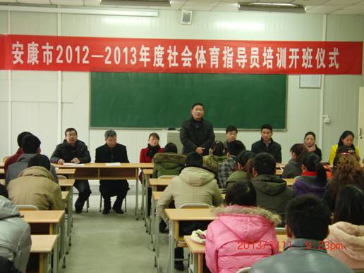 2013年1月12日上午9:00,安康市2012-2013年度社会体育指导员培训班开班典礼在我校举行。安康市体育局党组成员、纪检组长陈复勇、安康团市委副书记梁鸿、安康市体育局群体科科长朱小燕、安康学院体育系主任冯德学、安康学院体育系副主任鲁宗成等领导以及部分授课教师和全体学员共一百余人参加了开班典礼,典礼仪式由安康学院体育系党总支书记沈军主持。