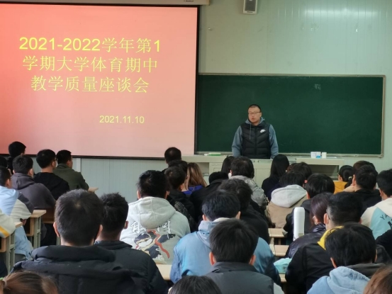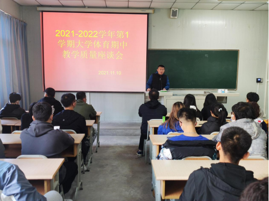为了切实做好《大学体育》课程的教学工作,了解教学现状,科学安排教学内容,提高教学质量,促进大学体育教学改革,2021年11月10日下午2点30分,beat365官方网站在江南校区1028教室召开了2021—2022学年第一学期大学体育期中教学工作座谈会。beat365官方网站副院长郭西魁、大学体育教研室主任李强以及各二级学院体育部干事、2020级和2021级各班班长、体育委员参加了本次座谈会。会议由李强老师主持。