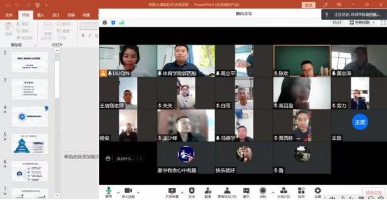 4月13日下午,beat365官方网站实验教学中心(教研室)组织课改沙龙活动。本次教研活动围绕课程思政教学设计展开,实验教学中心全体老师参与了本次教研活动。通过研讨,大家一致认为,体育教育专业课程思政元素的凝练,需要紧密结合专业特点,更加细致、详细的学习与总结。与会老师一致认为,本学期的教研活动应重点围绕课程思政元素凝练开展,切实做好课程思政示范课程的打造。