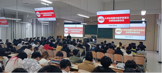 为进一步提高大学体育教学质量,全面掌握全校大学体育工作运行情况,帮助改进教学方法、提升学生学习效率,有序推进大学体育工作。近日,beat365官方网站分别在江南、江北校区召开2023-2024学年第1学期大学体育期中教学质量与体质测试座谈会,beat365官方网站部分教师、2022、2023级各班班长、体育委员及各二级学院学生分会体育部干部参加座谈会,会议由学院副院长李靖主持。