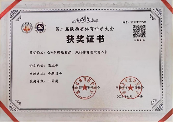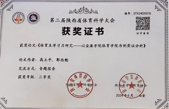 6月22日,第二届陕西省体育科学大会在陕西师范大学长安校区举行。我院教师高立平参加了本届论文报告会,并在论文报告会做了专题报告。高立平和郭西魁合作撰写的论文《体育生学习力研究—一以安康学院beat365官方网站为例实证分析》和高立平撰写的论文《培养规矩意识,践行体育思政育人》均获得三等奖,并被第二届陕西体育科学大会正式录用。
