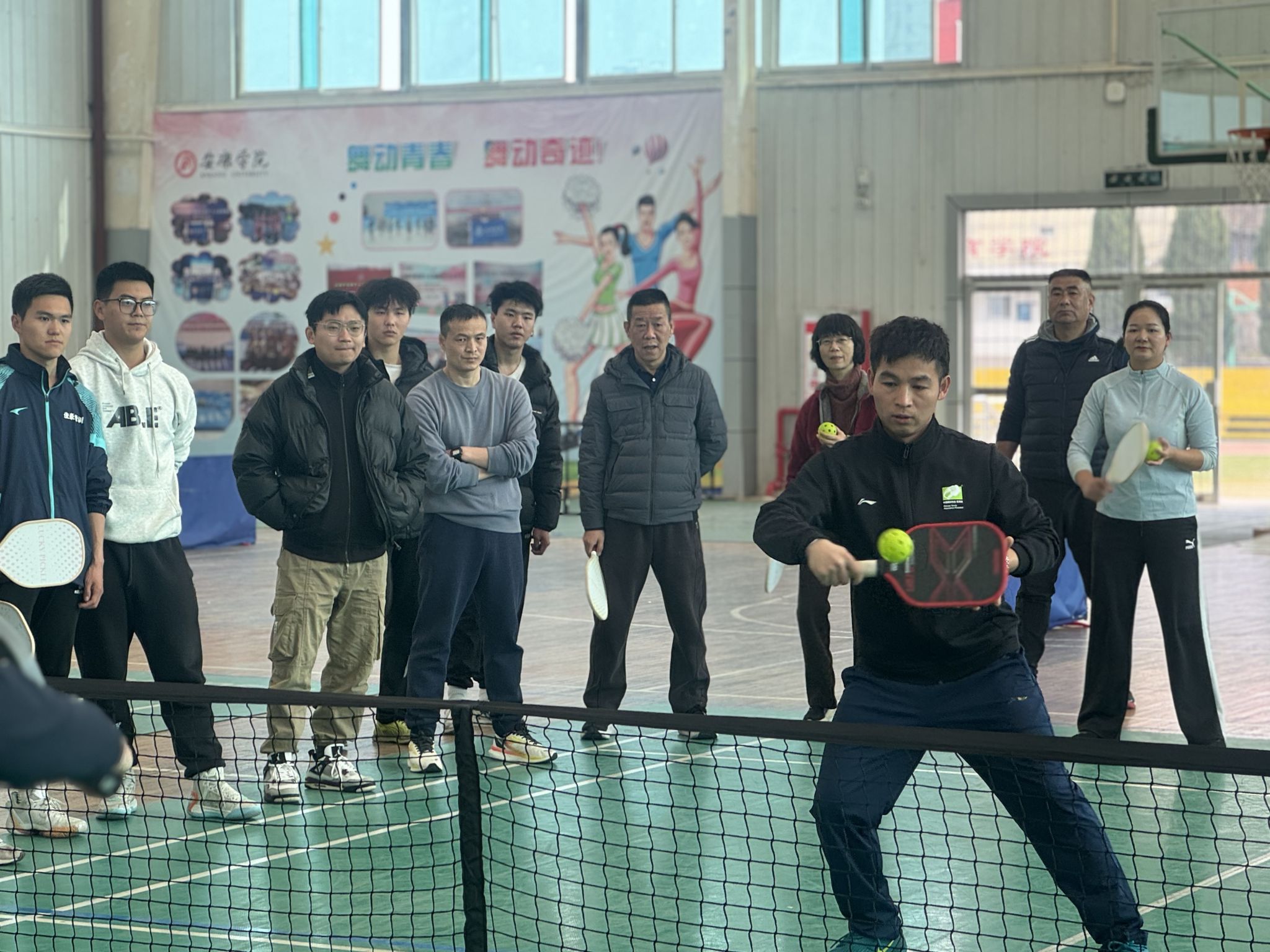 在理论讲座环节,曹峰教授从匹克球的起源、技术、规则解析、战术策略等,进行了系统而深入的讲解。随后的实践环节,他结合自身多年的教学经验,深入浅出地剖析了匹克球的技术要点,并在现场亲自示范标准动作,耐心纠正学员们的错误姿势。在曹峰教授的指导下,大家从基础挥拍到战术配合,逐步掌握了匹克球的实战技巧。现场气氛热烈,学员们热情高涨。