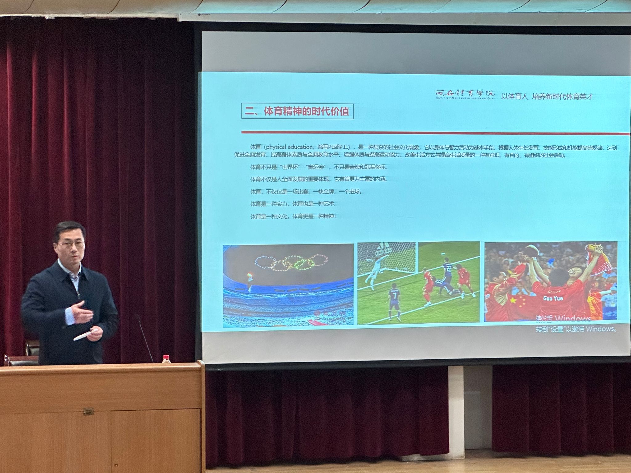 12月1日晚,我院在1号教学楼6楼报告厅举办“以体育人——培养新时代体育英才”学术讲座,主讲人:西安beat365官方网站体育教育学院党委书记高月宏教授。院长吕仙利、党总支书记高立平、副院长郭西魁、团总支书记刘姚成以及2023级新生聆听了讲座,仪式由郭西魁主持。