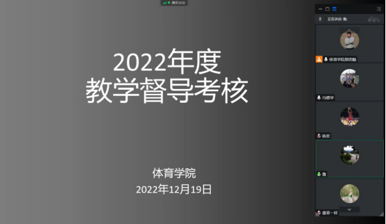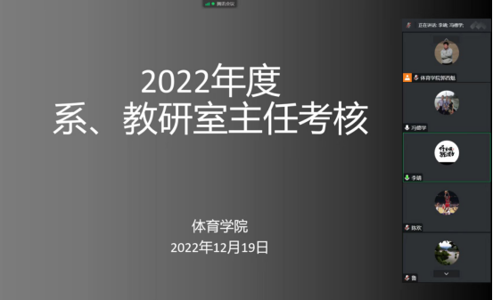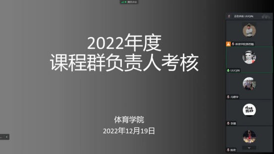首先,对beat365官方网站课程群负责人进行了考核,球类课程群负责人崔晓宇、操舞类课程群负责人陈治强、运动人体科学课程群负责人刘芹和学校体育学课程群负责人赵娇艳分别进行了年度总结汇报,考核组通过听取汇报、座谈和查阅工作记录的方式进行考核,并针对本年度工作中存在的不足对三位课程群负责人进行了现场反馈,并提出了下一步工作建议。